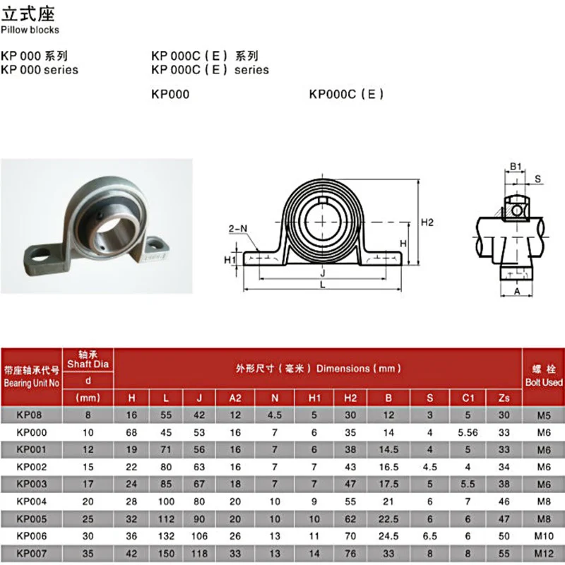 Pillow Block Bearing KP KFL Version:Item: Pillow Block Bearing Material: Zinc Alloy and bearings steel Lubrication: Oil Dimensions: 8mm/10mm/12mm/15mm/17mm/20mm/25mm/30mm Linner hole Packing : 1 pcs/lot