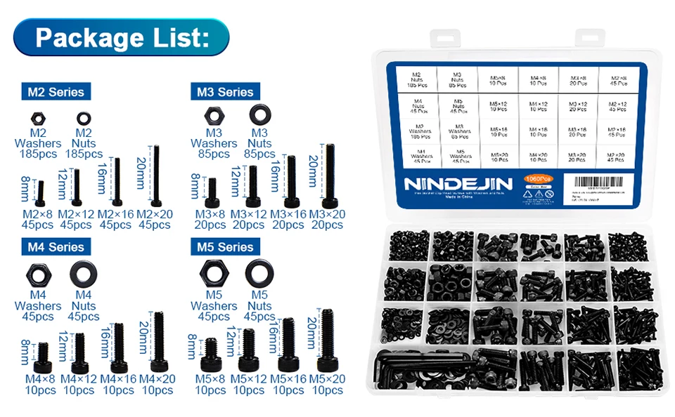 Quantidade do pacote: 1060pcs parafusos porcas e arruelas incluídas (M2, M3, M4, M5)