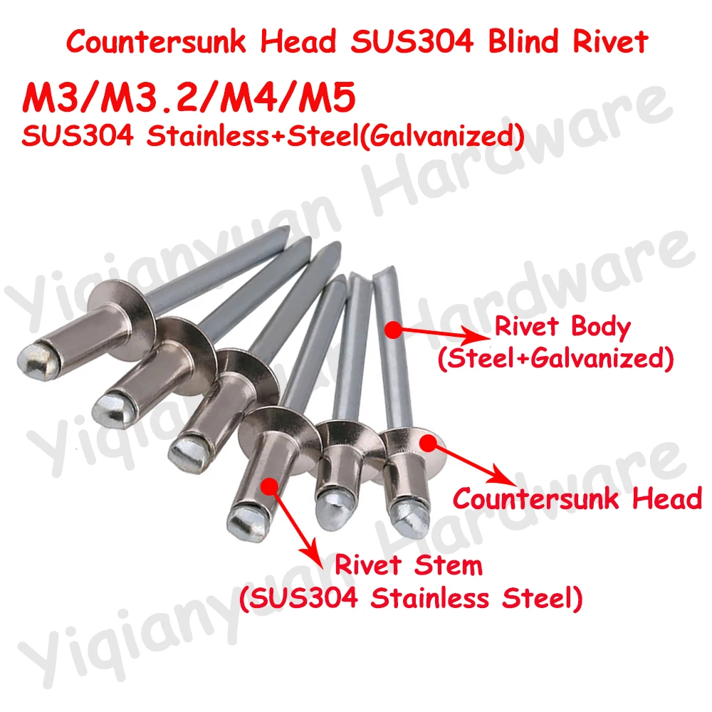 10Pcs ~ 30Pcs M3 M3.2 M4 M5 SUS304 Aço Inoxidável Cabeça Rebaixada Quebrar Mandril Cego Rebites Puxe Prego Pop Open End Rebites