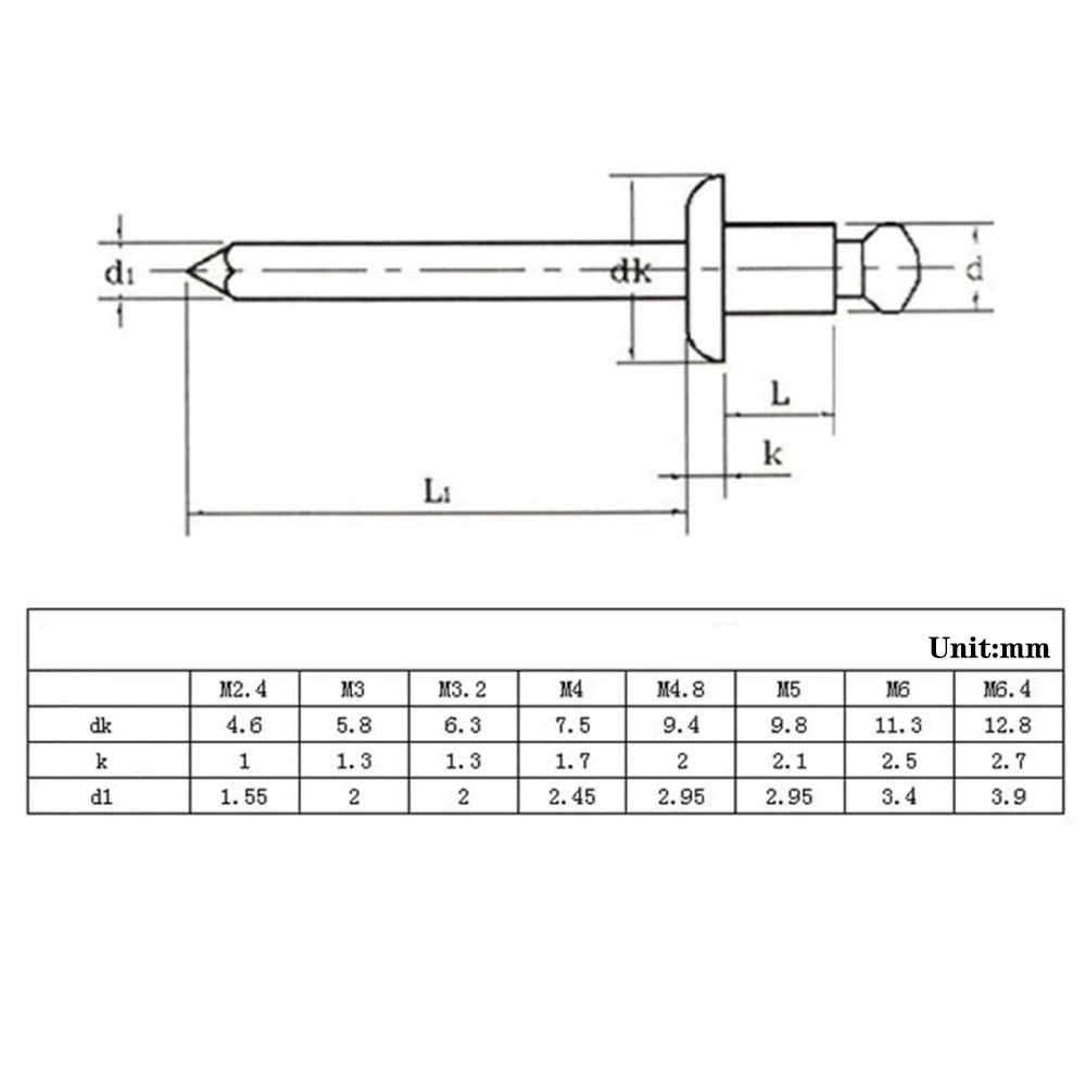 Nome do produto: 30-50Pcs Pop Rebites De Alumínio M2.4 M3.2 M4 M4.8 Dome Head Blind Rebites De Aço Haste Mandril Rebites De Escape Puxe Prego